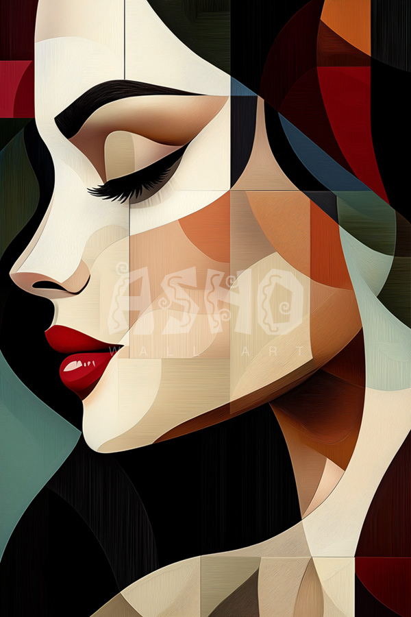 A graceful female profile in cubist elegance, blending warm tones with modern shapes and soft shadows. Printed on durable vinyl, mounted on thick MDF wood panel, water and dust resistant.