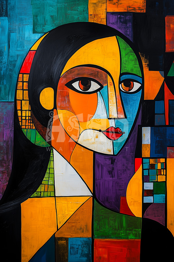 An expressive cubist-style portrait of a woman with vivid shapes and bold color fields. Printed on durable vinyl and mounted on thick MDF wood panel—resistant to water and dust, perfect for bold interiors.