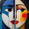 Striking cubist-style mosaic of two interlocking faces in bold, vibrant tones. Printed on durable vinyl, mounted on thick MDF wood panel, water and dust resistant.