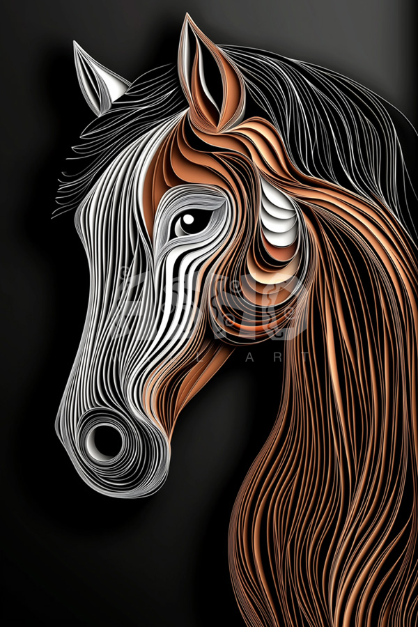 This striking paper-art depiction of a horse showcases flowing lines and smooth curves. The contrast of white, brown, and black emphasizes the graceful movement of the animal. Printed on premium MDF wood, this dynamic artwork adds a sense of fluid elegance to any space.