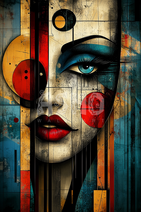 A bold, geometric portrayal of feminine mystery. This artwork blends cubism with street-style pop to create an unforgettable visual impact.
