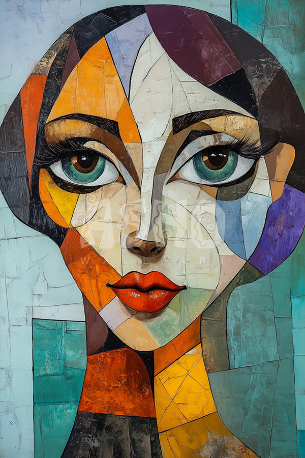 Captivating cubist portrait of a woman with large expressive eyes and bold color fragments. Printed on durable vinyl, mounted on thick MDF wood panel, resistant to water and dust.