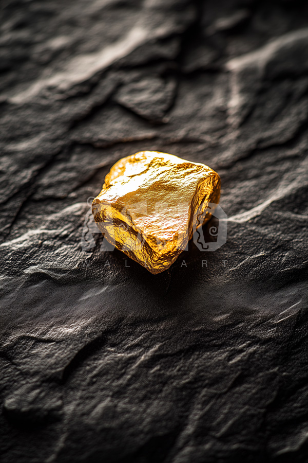 A close-up of a shimmering gold nugget resting on textured black stone. The sharp contrast between the golden hue and the rough surface highlights the precious nature of this treasure. Printed on premium MDF wood, this artwork brings elegance and luxury to any space.