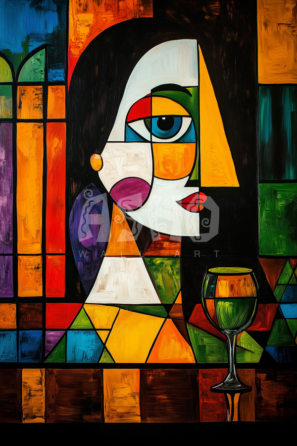 A bold, cubist reinterpretation of a woman at a bar, filled with color blocks and sharp lines. Printed on durable vinyl and mounted on thick MDF wood, resistant to water and dust—an eye-catching conversation starter.