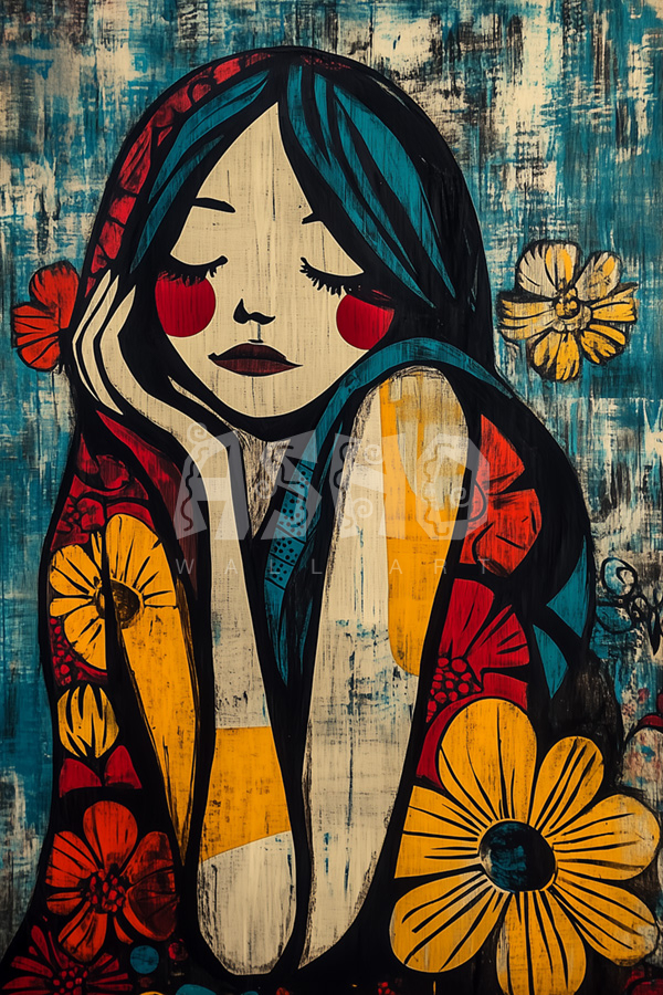 A dreamy female portrait with closed eyes and blooming flowers, inspired by linocut textures and modernist charm. Printed on durable vinyl, mounted on thick MDF wood panel, water and dust resistant.