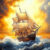 A majestic ship sails boldly through a turbulent sea, with dramatic skies and golden light illuminating the scene. This painting captures the beauty and power of nature and adventure.