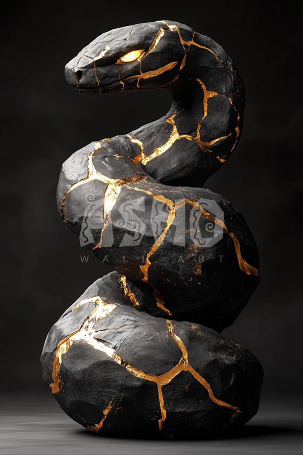 A striking sculpture of a snake made from black rock, with golden cracks running through its body. The glowing eyes add a touch of mystique and power, turning the piece into a symbol of transformation, wisdom, and strength. The intricate details highlight the fusion of nature and artistry.